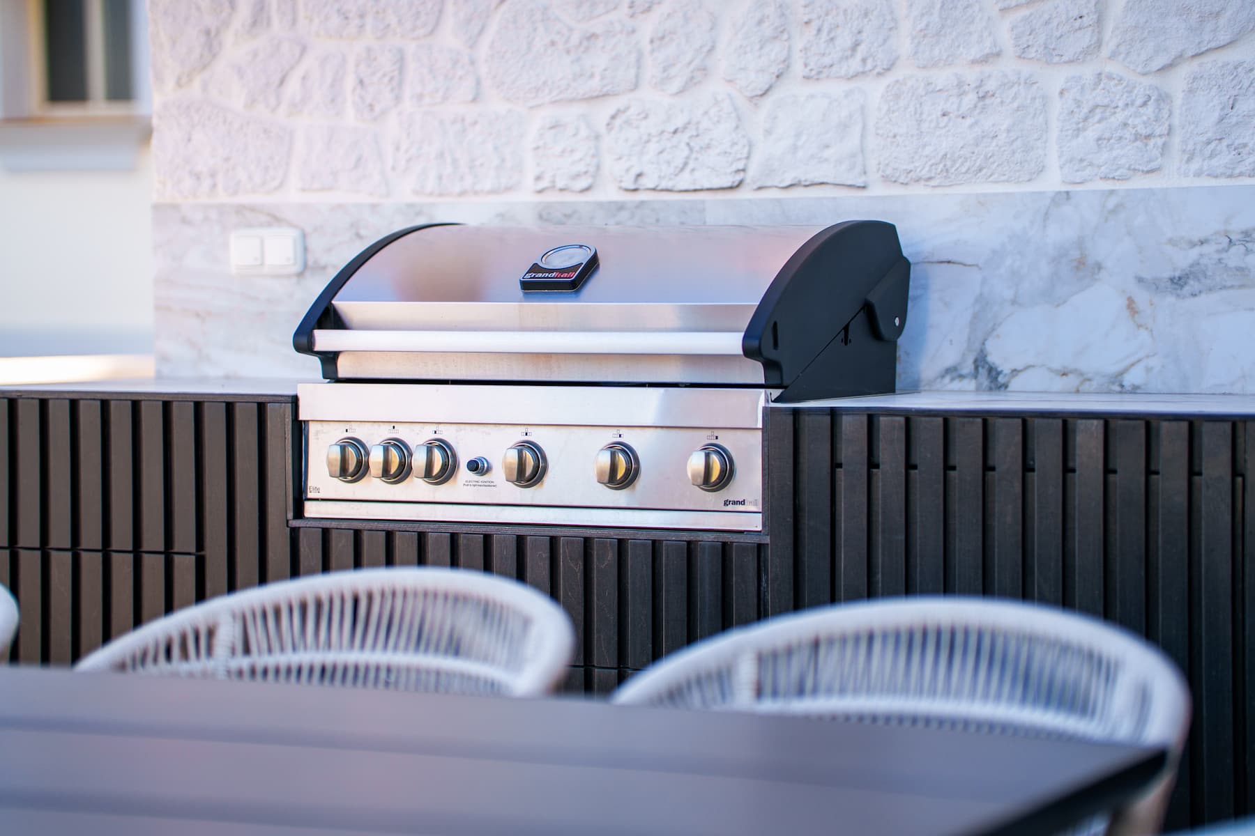 The open-plan living area connects seamlessly to a large private terrace with breathtaking sea and mountain views. The outdoor space includes a fully equipped outdoor kitchen and barbecue area, complemented by high-quality UV plants for privacy and aesthetics.