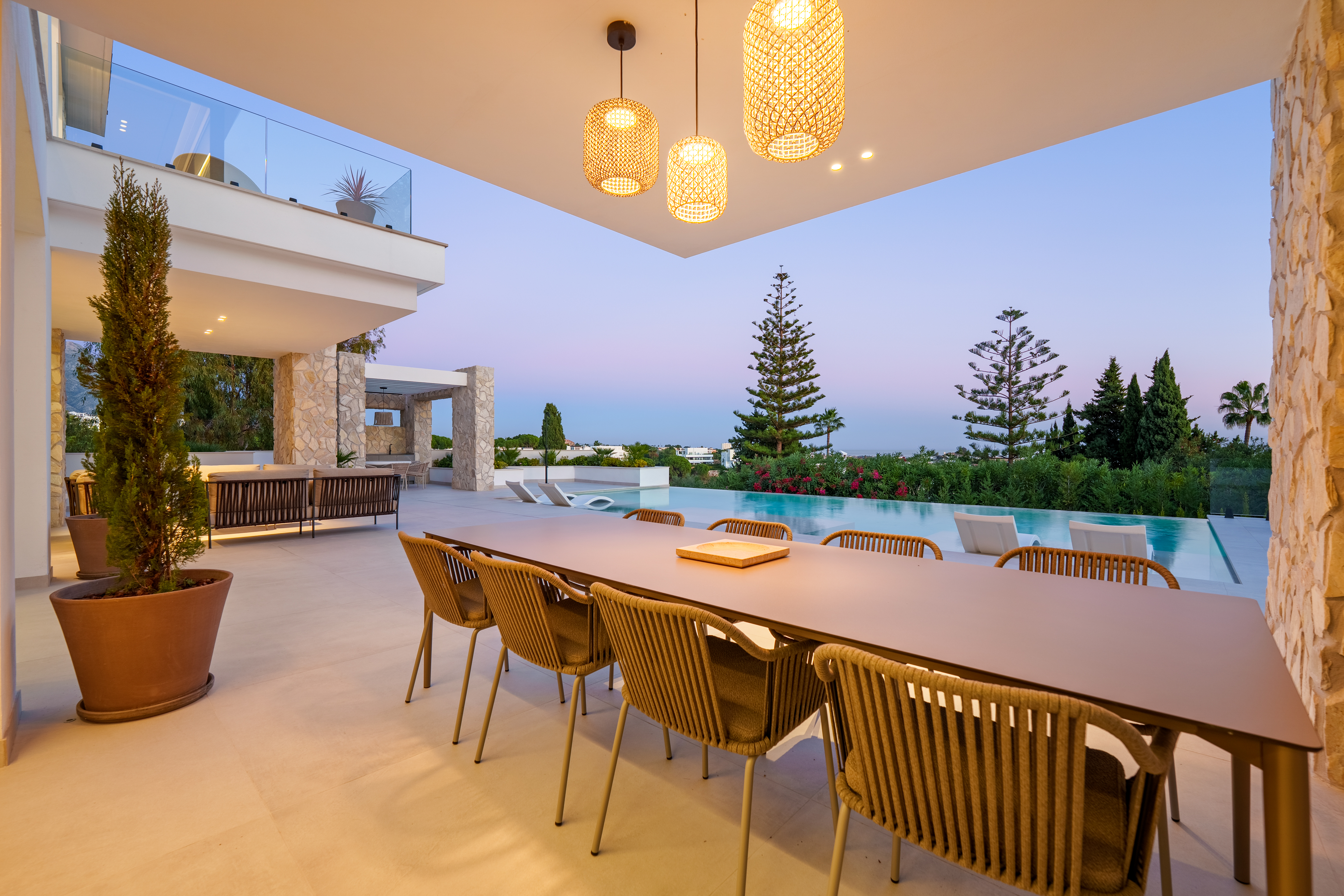 Con 605 m² construidos distribuidos en tres niveles, la villa dispone de cinco dormitorios y cuatro baños, diseñados con una cuidada atención al detalle y acabados de alta gama. La planta principal presenta un amplio espacio de salón y comedor de concepto abierto que se integra perfectamente con generosas terrazas y una impresionante piscina infinity de 73 m², creando un estilo de vida interior–exterior ideal para el ocio y el relax. Los ventanales de suelo a techo inundan la vivienda de luz natural y realzan su diseño contemporáneo.