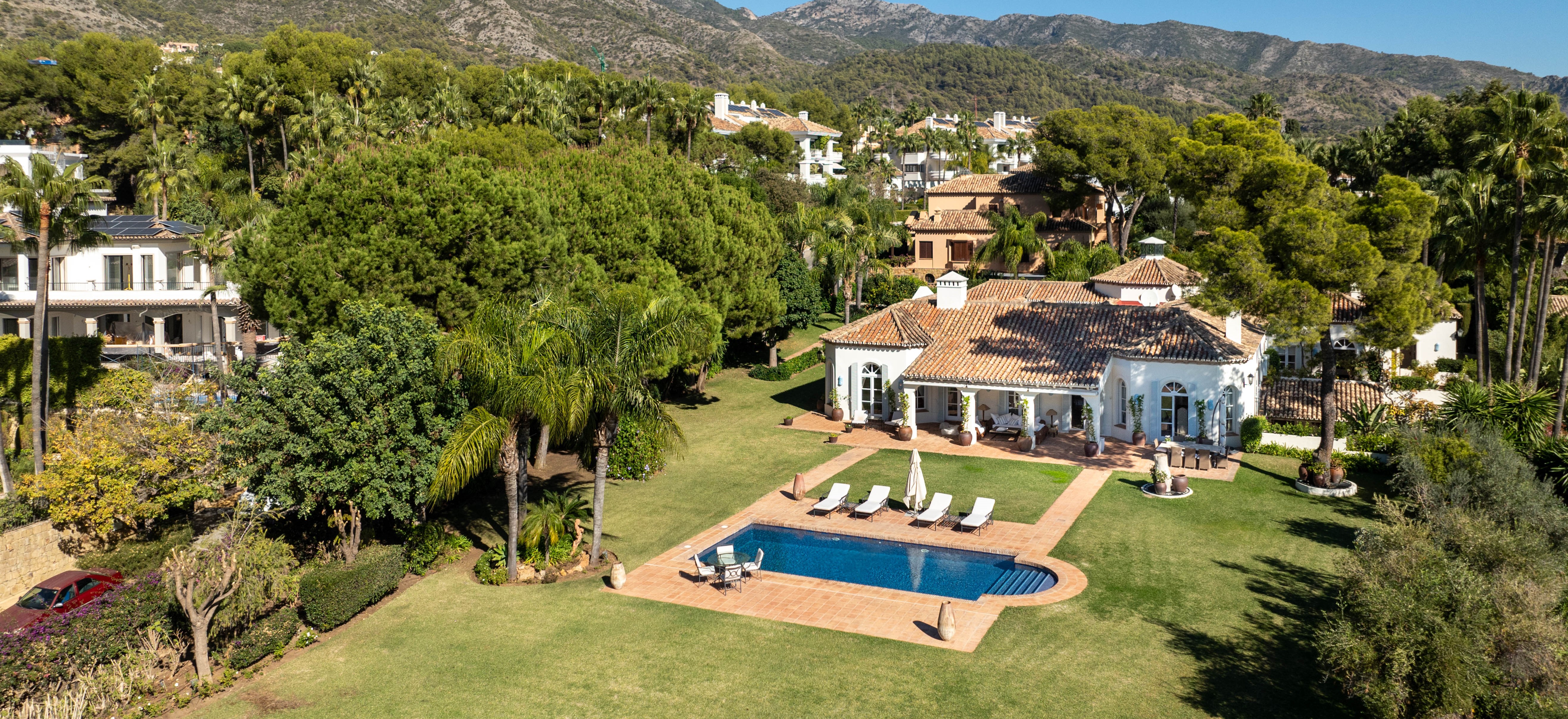 En el interior, la vivienda ofrece una atmósfera clásica y sofisticada, con techos altos y vigas de madera que realzan la sensación de amplitud. Las zonas de salón, comedor y cocina fluyen con armonía, creando un entorno acogedor y funcional. La villa dispone de 7 dormitorios de lujo, destacando una impresionante suite principal, convirtiéndola en una residencia única para quienes buscan exclusividad en la Milla de Oro de Marbella.