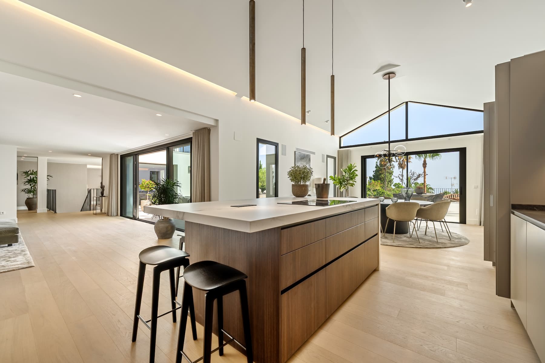 La propiedad ofrece amplios espacios abiertos, un elegante salón-comedor con cocina de diseño, cinco dormitorios en suite y una exclusiva zona de entretenimiento con bar, bodega acristalada y mesa de billar.