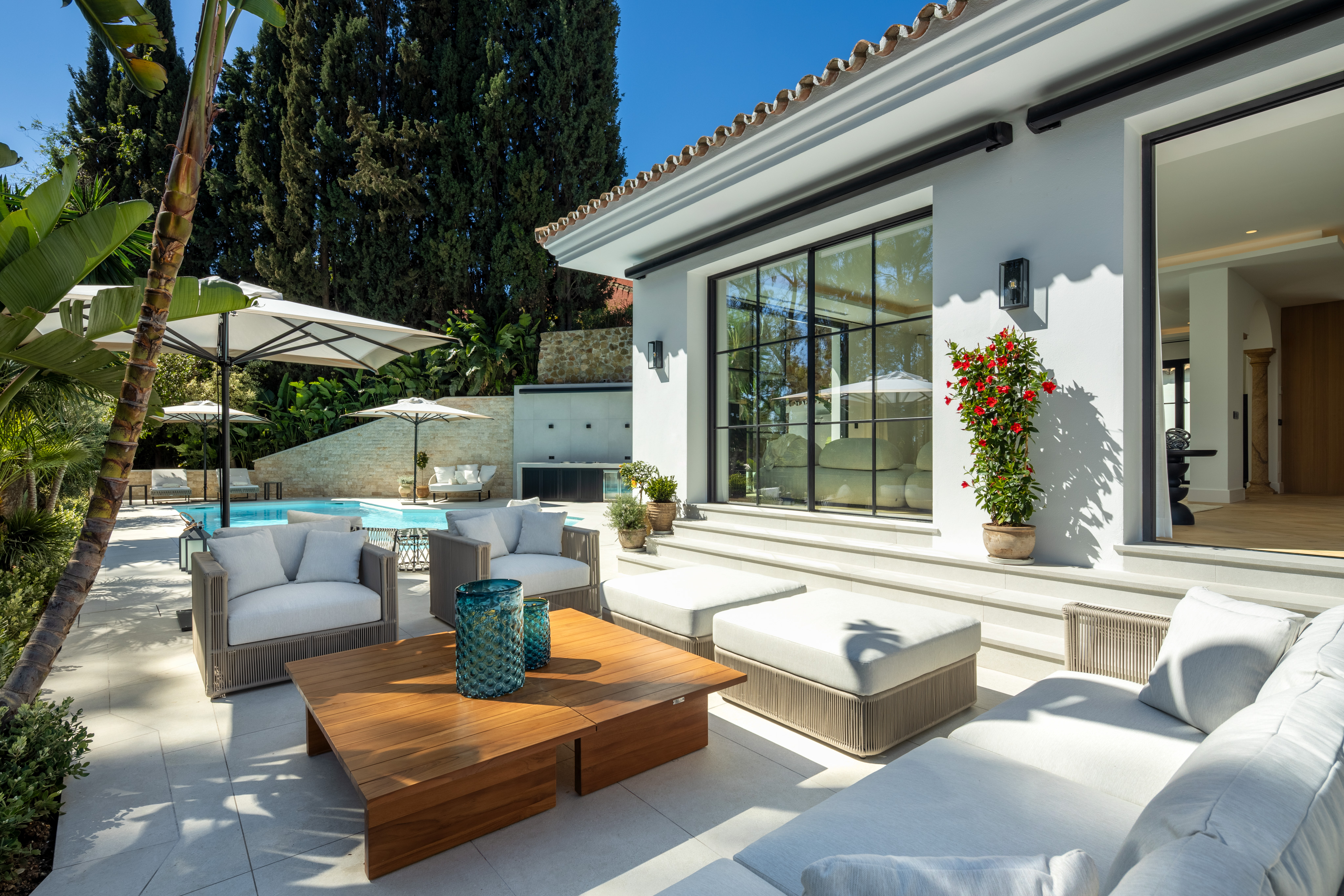Introducing Herrojo 21, a remarkable villa set in the heart of La Quinta, positioned on a prestigious and elevated frontline golf plot within the secure gated community of El Herrojo Alto. This landmark property blends architectural elegance with modern functionality, offering panoramic and far reaching views across the fairways to La Concha mountain. A seamless indoor-outdoor flow is achieved through expansive glass sliding doors that open onto immaculate terraces, where a private outdoor pool and kitchenette with BBQ create the perfect space for entertaining or relaxing under the sun. Inside, the interiors are nothing short of exceptional. Curved archways enhance the aesthetic while maintaining an open-plan layout that flows effortlessly from room to room. The kitchen and dining area are true highlights—adorned with natural wood and designed with both style and practicality in mind. Equipped with premium appliances and custom cabinetry, the kitchen merges form and function. Two elegant living areas, one more intimate than the other, provide flexible options for hosting or unwinding, all furnished with carefully selected pieces that elevate the overall ambience. This brand new reformed property offers five generously sized bedrooms, each crafted for modern comfort, with the master suite standing out as a true statement of luxury. It features an exquisite walk-in wardrobe, a grand en-suite bathroom with a double vanity, freestanding tub, and a stand-in shower.